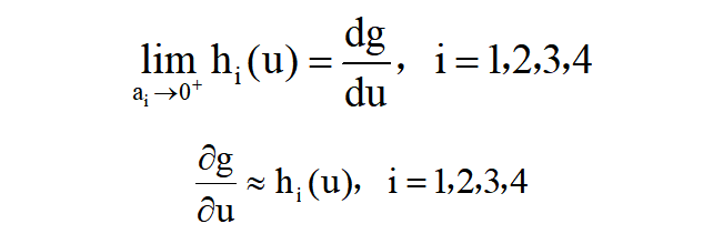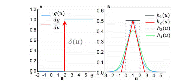 其中ai(i=1,2,3,4)决定了曲线的陡度,即峰值宽度。事实上,h1,h2,h3,h4分别是矩形函数、多项式函数、s型函数和高斯累积分布函数的导数。为了与狄拉克函数δ(u)一致,我们引入系数ai来保证每个函数的积分为1。显然,可以证明,上述候选项均满足,由此得到下面的式子。