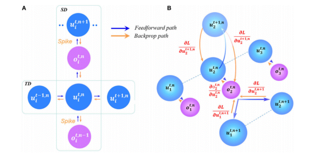 先观察图中A部分,我们把神经元ui(t,n)(在t时刻第n层第i个神经元)当作中心,分别观察水平方向TD左右:其左侧的ui(t-1,n)代表在时间t-1时刻的神经元,其右侧的ui(t+1,n)代表在时间t+1时刻的神经元,以此类推左右其实有很多个没有画出的神经元(如果设置的时间为t,则可以画出t个神经元来表示一个神经元在不同时刻的状态),它们按照时间依次传递给下一时刻的自己(从左向右)进行前向传播,逆着时间依次沿着原路传递给之前的自己(从右向左)进行反向传播。现在,我们观察垂直方向SD上下:其下方的**oi(t,n-1)代表来自第n-1层的第i个神经元传递过来的膜电压Spike,其上方的oi(t,n)**代表传递给第n层的第i个神经元传递的膜电压Spike正向传播至第n+1层的第i个神经元。