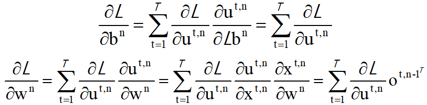 上式中ys表示训练样本的标签向量(one-hot编码),**os(t,N)**表示在时间t时最后一层N的第s个神经元输出向量,由于它是经过时间T积累的,因此在进行均方误差计算之前,先进行均值化。最后再根据均方误差函数进行整理便可以得出上面的脉冲神经网络的损失函数的表达式。通过表达式可以看出损失函数L是关于W和b的函数,因此,对于梯度下降而言,获得损失函数相对于W和b的导数是必要的。
