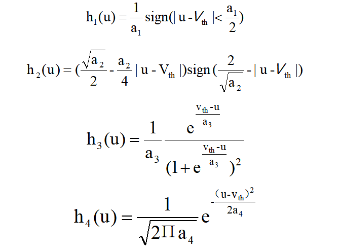 前面介绍了如何基于STBP获取梯度信息,但是尚未解决每个峰值时间的不可微分问题。实际上,STBP训练需要输出门g(u)的导数,从理论上讲,g(u)是δ(u)的不可微Dirac函数,这极大地挑战了SNN的有效学习。g(u)在各处都具有零值,除了无穷大值(在零位置处)之外,这会导致梯度消失或爆炸问题,从而无法传播误差。现有方法之一将尖峰时刻电位的不连续点视为噪声,并声称它对模型的鲁棒性有益,但它没有直接解决非噪声的问题。峰值活动的可区分性。为此,我们引入了四个曲线来近似表示尖峰活动的导数: