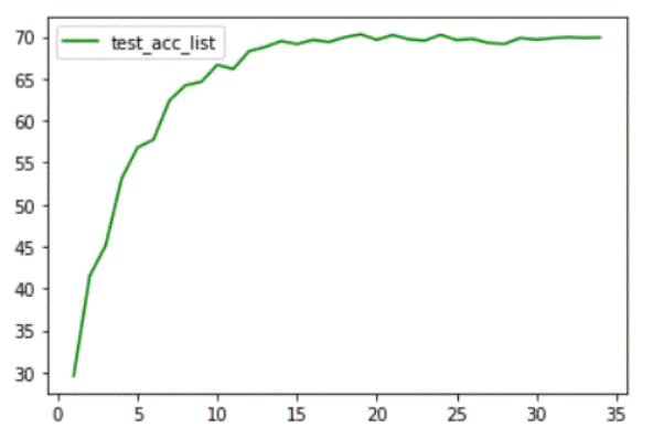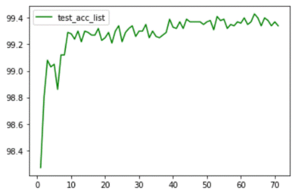 SNN_STBP_MNIST和SNN_STBP_CIFAR10两个网络模型的性能图像分别如下图所示。对于SNN_STBP_MNIST模型很快便能达到很高的正确率,随后稳定在99.4%左右。对于SNN_STBP_CIFAR10模型,刚开始损失比较严重,随着训练次数的增加,模型正确率稳定于70%左右便不再升高。