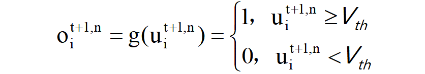 上式子主要表示:神经元最终的输出情况,在传递给下一层前需要经过一个阈值函数进行峰值处理,其中**oi(t+1,n)**代表在时间t+1时第n层中第i个神经元的输出(0或1),g(x)函数属于一个阈值函数,当x大于等于Vth时神经元输出1(即尖峰事件),当x小于Vth时神经元输出0(沉默)。